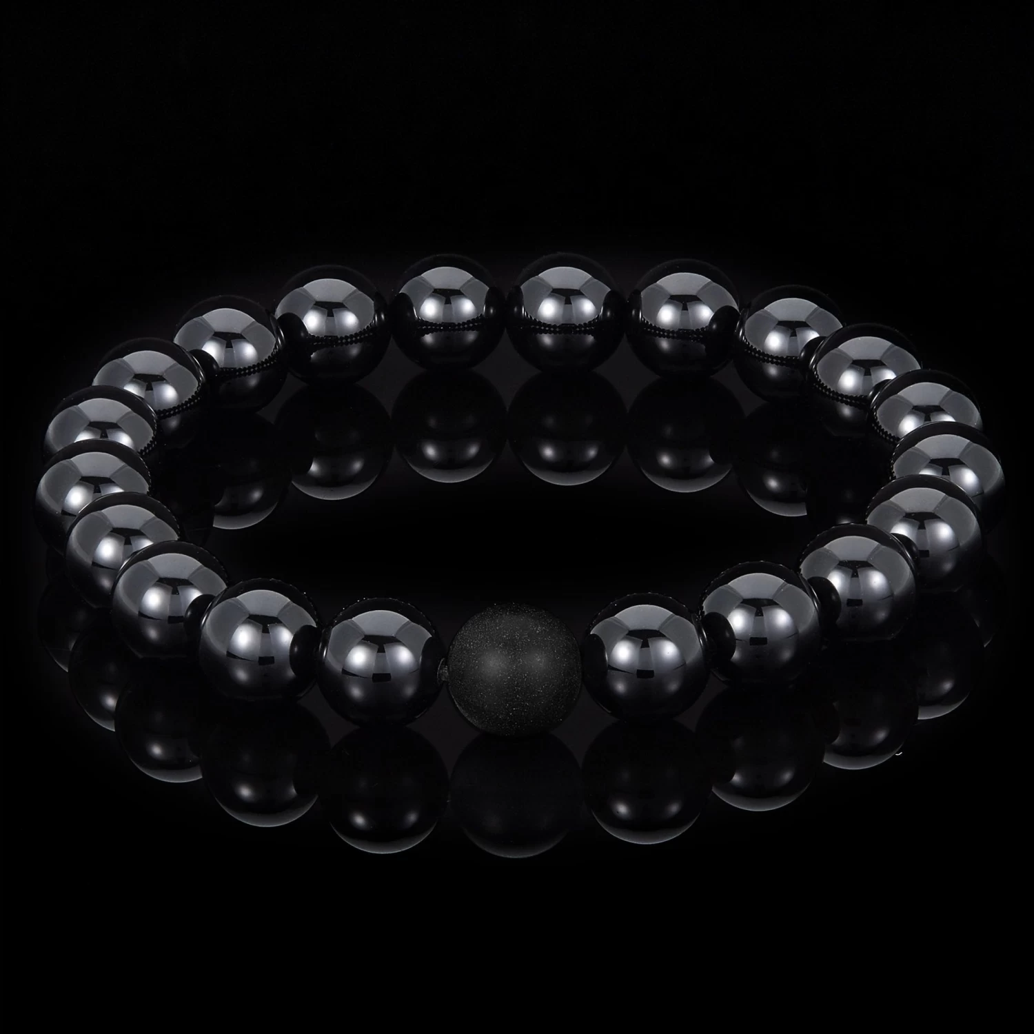 Wear this sharp and stylish bead bracelet to reflect your unique style. The stretch bracelet has 20 natural stone beads contrasting one matte onyx bead each measuring 3/8 inches wide.
