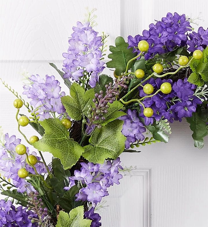 - Keepsake wreath is crafted with authentic faux purple lilacs in shades of lavender and deep lavender; accented with variegated ivy and green hypericum berries