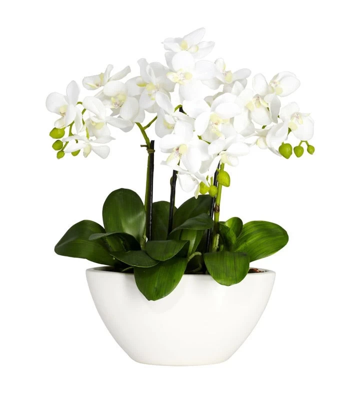 Bring the brightness of a sunny day to any room in your home with this gorgeous Triple Mini Phalaenopsis. With three distinct stems sprouting forth from a lush base of green leaves culminate in soft, bright blooms (replete with berry buds for contrast.) This “bundle of sunshine” comes complete with a beautiful white bowl-vase planter. Makes an ideal gift.