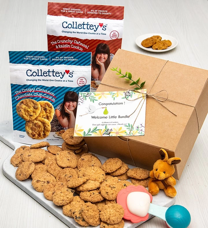 Collette’s famous cookies with party a personalized Welcome Little Bundle card, a baby rattle, small stuff animal, along with and a story card from Collette about her journey and the incredible mission of the company.