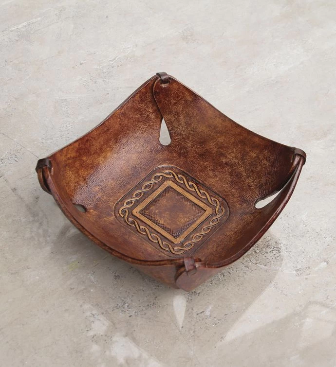 Corral keys, wallets, and coins on a desk or entryway with this hand-tooled leather catchall. Designed by Johnny Jimenez, it features a lasso motif inspired by the cowboys who live and work in Peru’s Andean highlands.