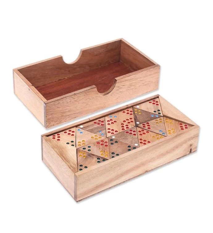 By Thai artisan Waraporn Khamsuk, this domino set offers a unique twist on the traditional tabletop game. Handmade from raintree wood, 56 triangular dominoes or “Trionimoes” come within a handy wooden box.