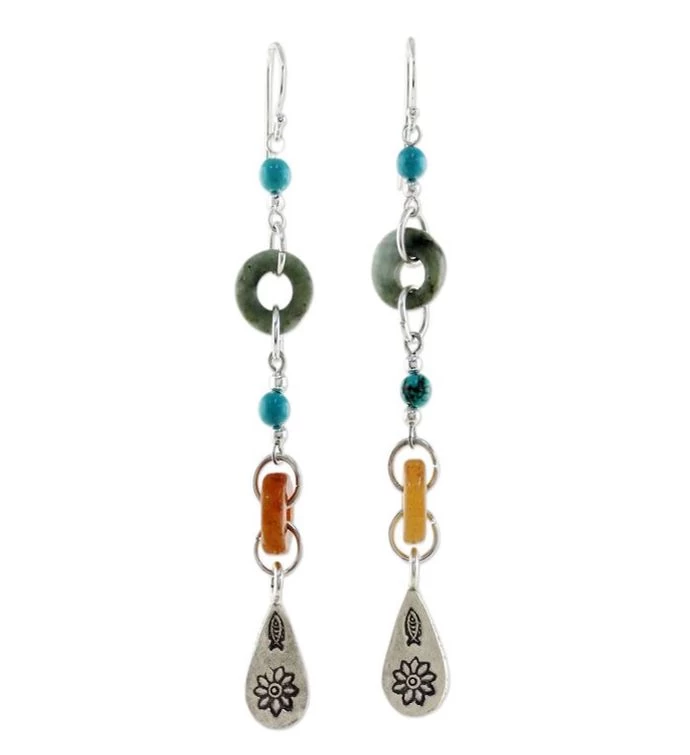 Featuring teardrop-shaped charms of hill tribe silver that are stamped with assorted traditional motifs, the earrings are crafted from jade, dyed quartz and turquoise-hued calcite.