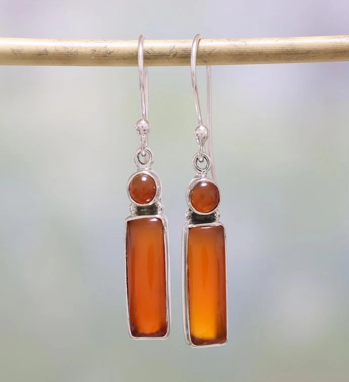 Using round and rectangular gemstones, artisan Babun Dey of India creates this striking pair of dangle earrings. They feature the glow of alluring carnelian set in a sterling silver bezel.