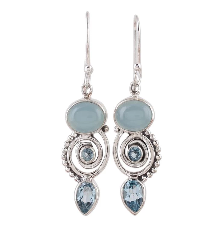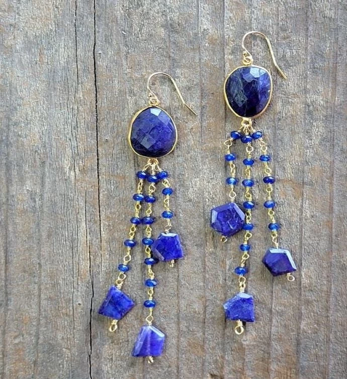 Gold dangle earring with one moonstone drop leading into 3 staggered moonstone beaded chain drops.