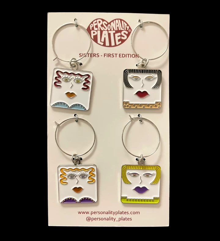 Set of 4, lightweight metal and enamel wine charms created with the same original designs as the Personality Plates – Sisters First Edition. A playful accessory for your wine glasses, or a wonderful add-on gift when gifting wine.