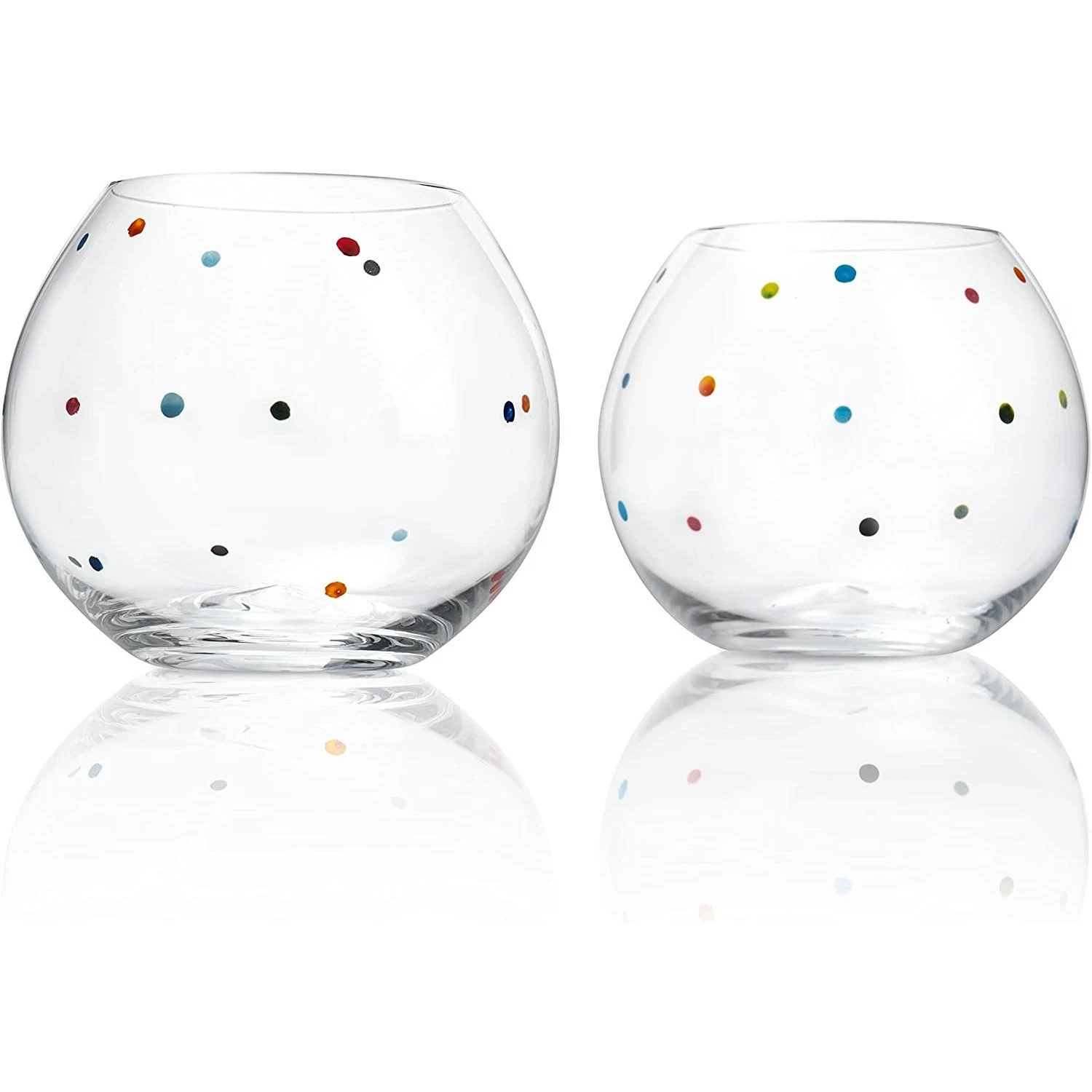 These cute Polka Dot Stemless Bubble Wine Glasses Set of 2 are the perfect addition to your table setting. With a bubble base and curvaceous design, drinking from these glasses is effortless and fun!