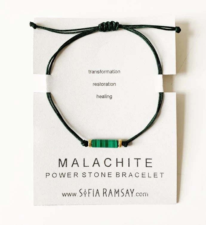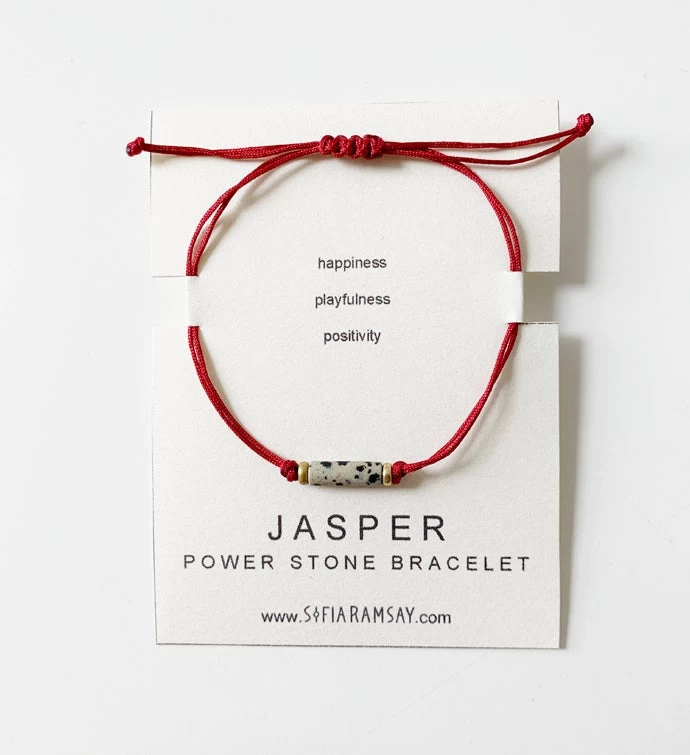 Handmade in Brooklyn, NY. Genuine semiprecious stone surrounded by solid brass beads and securely strung on adjustable cord bracelets. Each bracelet comes on a card describing its unique set of powers. The wearer will be powered up with the qualities each particular stone carries. Semiprecious stones are organic and no two are alike. Expect that your power stone will have unique inclusions and spiritual essence.