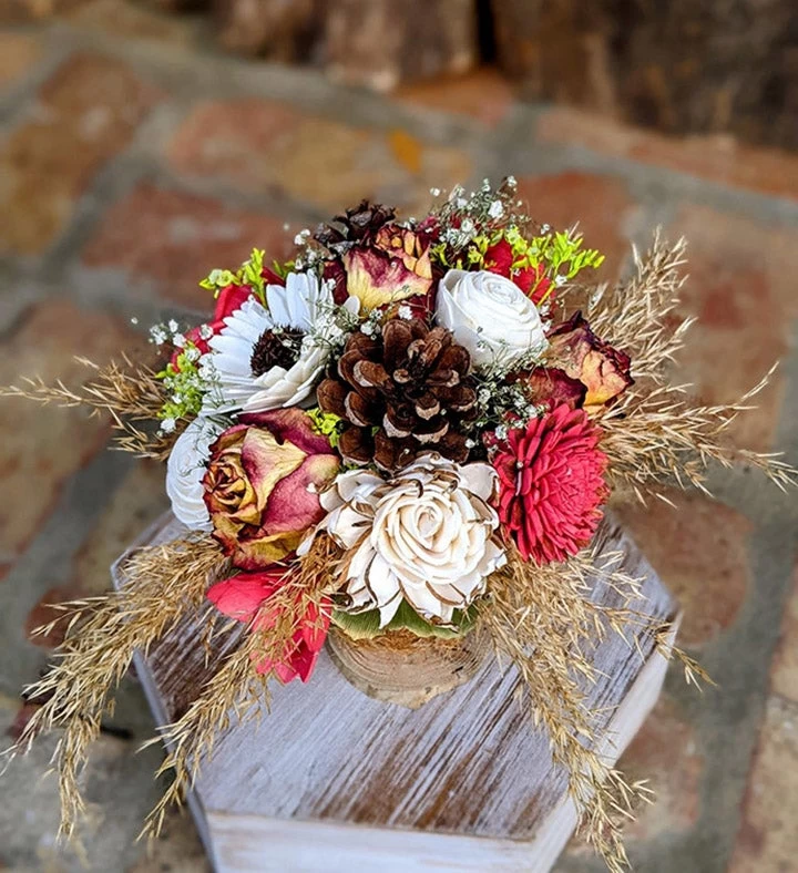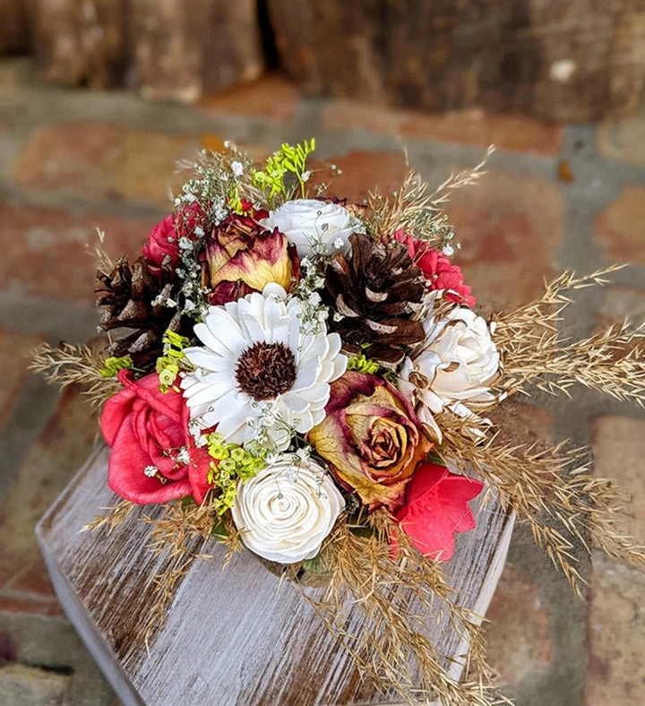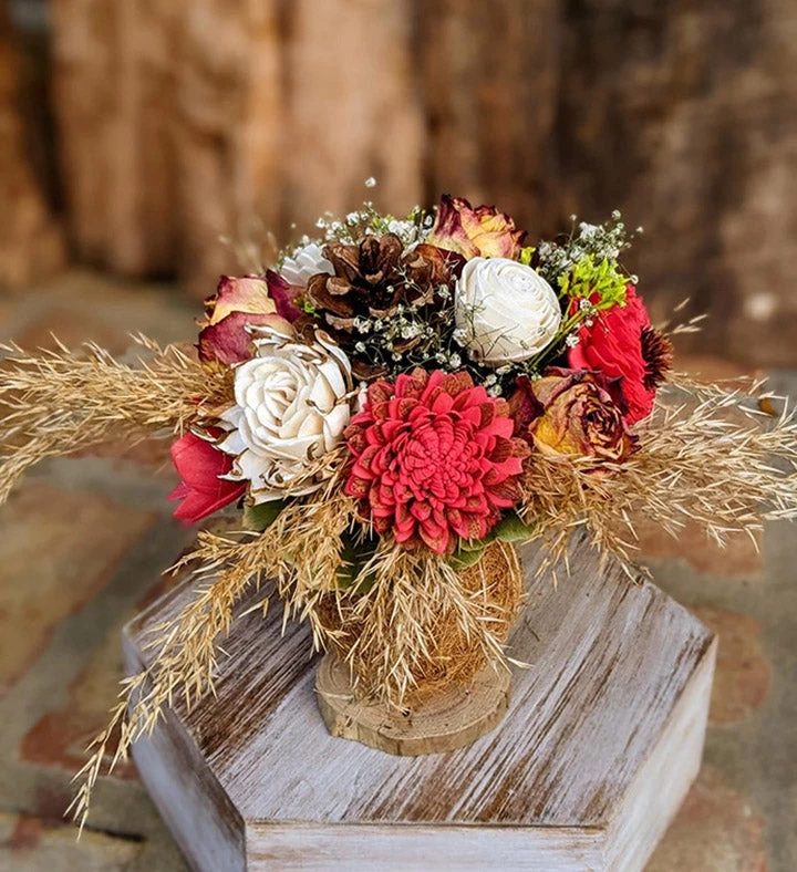 Contains: Sola Wood Flowers; Preserved Roses, Grasses and other botanicals.
