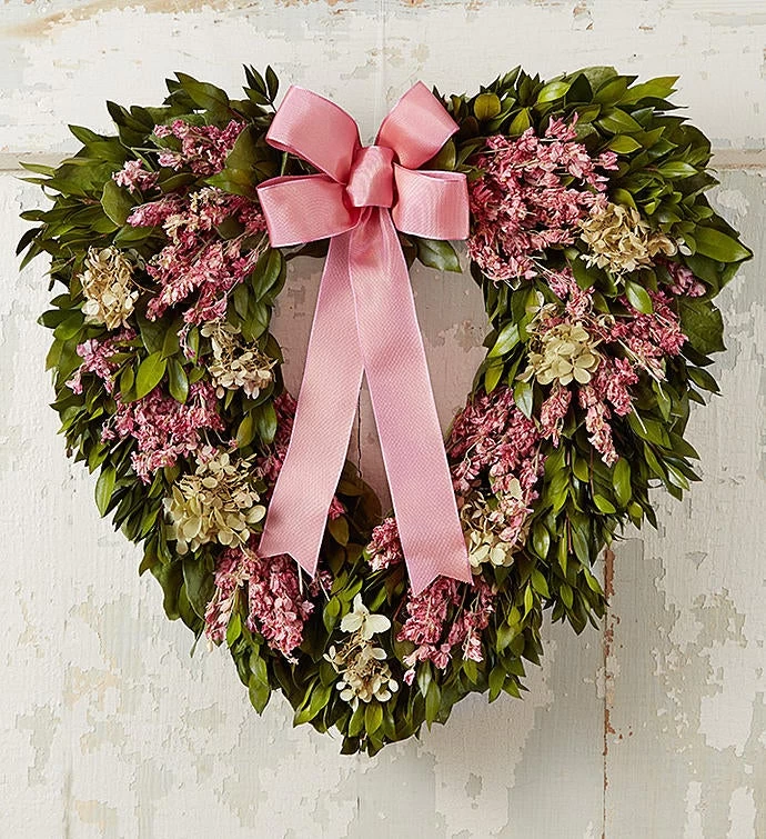 The most thoughtful gifts come from the heart. Our vintage inspired, preserved heart-shaped wreath is delicately handcrafted from Myrtle and pink hydrangea on a natural twig base, and finished with an iridescent, mauve-pink bow. Its sweet rustic beauty will welcome family and friends all year long.