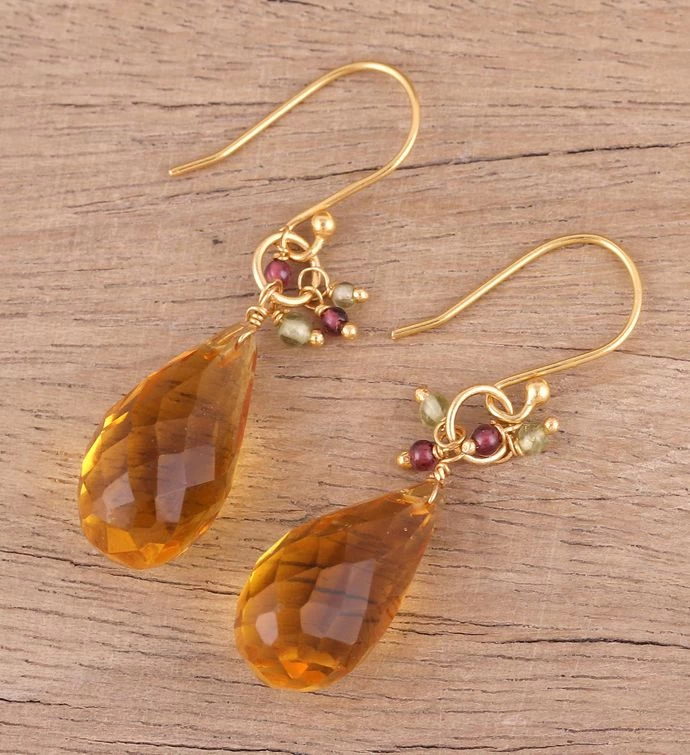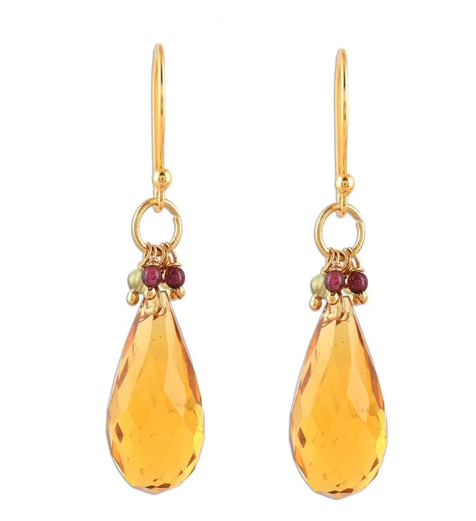 Drops of pale-yellow, shimmering, faceted citrine are accented by garnet and peridot beads and hang from a lustrous, 22 karat gold plated sterling silver hook.