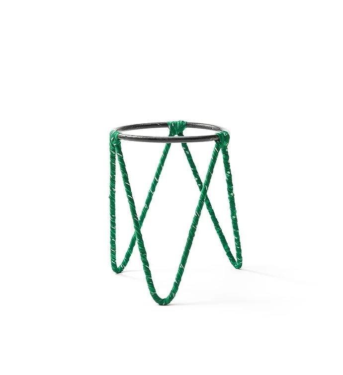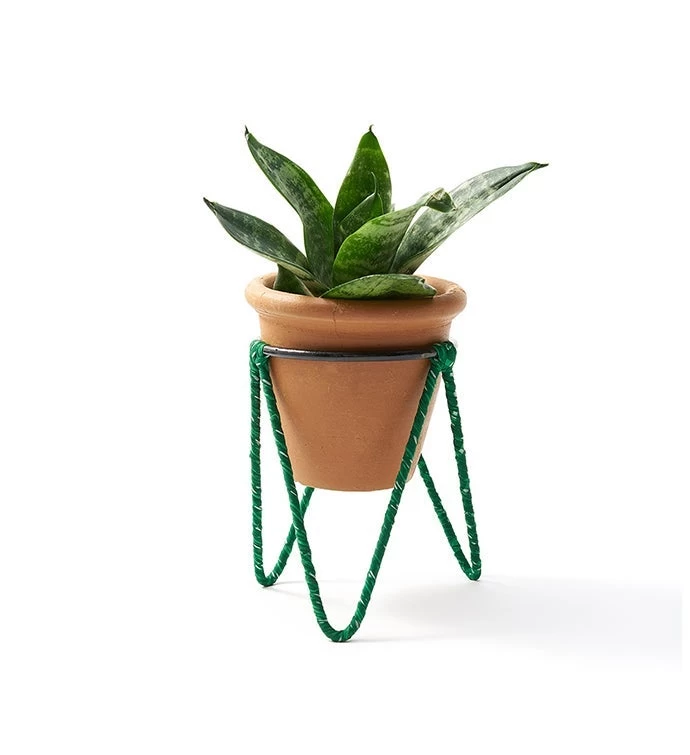 Planter stand features small terracotta plant pot suspended in a wire stand with assorted, upcycled sari wrapping and a drainage hole. Colors cannot be chosen.