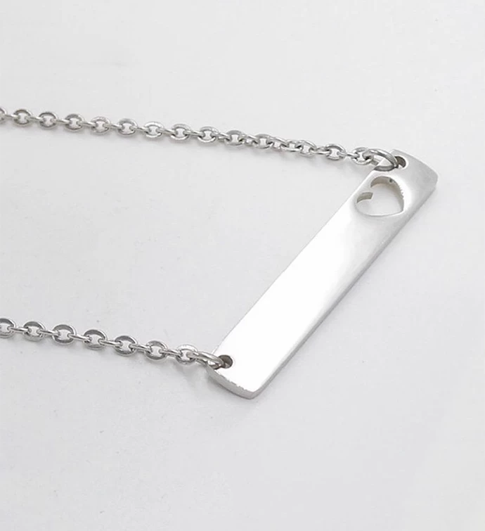 A delicate silver bar necklace with cut out heart is the perfect fashionable accessory. This dainty necklace makes for a great gift for the special someone in your life.