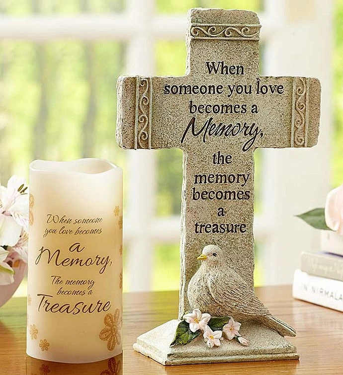 Honor their memory with this special remembrance cross. Designed to emulate hand-carved stone, it features a peaceful dove in beautiful raised detail and the heart-felt inscription: “When someone you love becomes a memory, the memory becomes a treasure.” This treasured keepsake makes a touching display in the home or at a cemetery or memory garden.