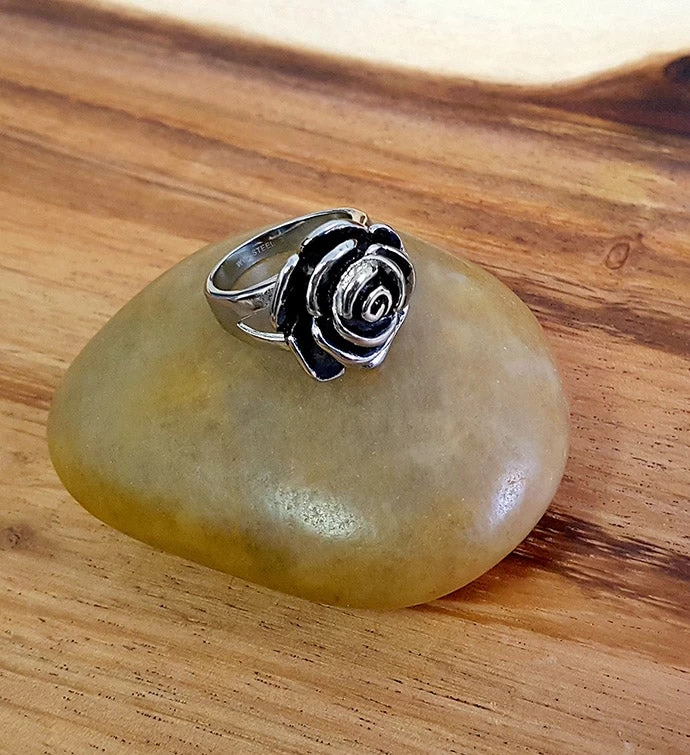 Stainless Steel Blooming Antiqued Rose Ring – Size 11