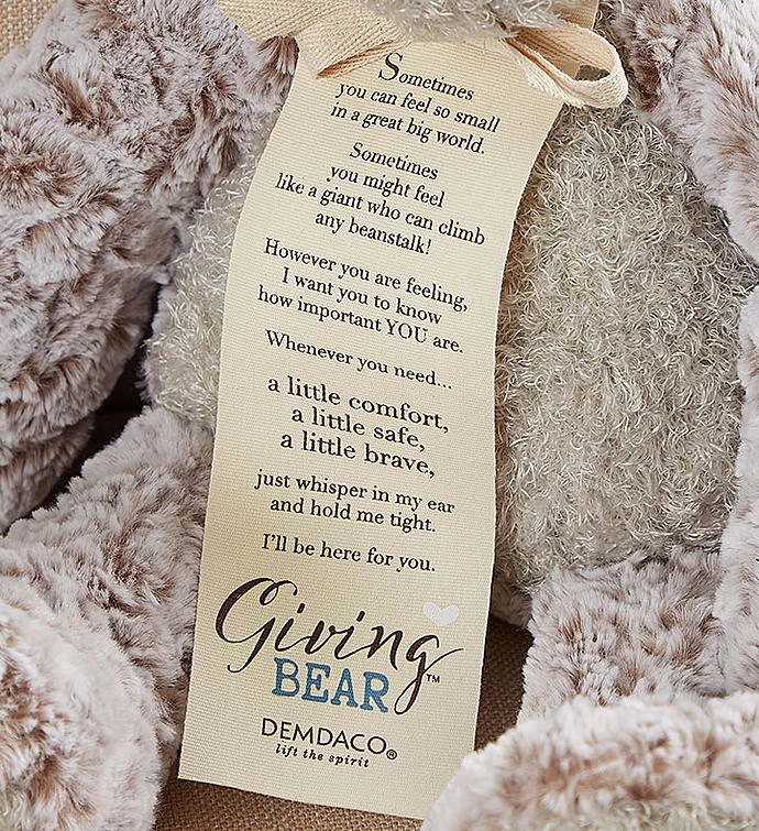 Send soothing comfort to loved ones of all ages with our precious Giving Bear. Ultra-soft and endlessly huggable, his unique corduroy ear stands out to show that he’s always listening to your secrets and feelings. Paired with an inspirational message tag, this is a special keepsake gift for reminding someone that a friend is always near.