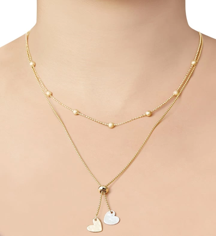- Features gold and silver-toned, dangling heart-shaped charms on a gold-tone necklace; adjustable chain offers versatile styling