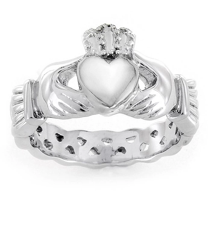 This ring features an Irish claddagh design with an eternity braid band. The hands represent friendship, the heart represents love, and the crown represents loyalty. Ring dimensions: 11mm long by 14mm wide.