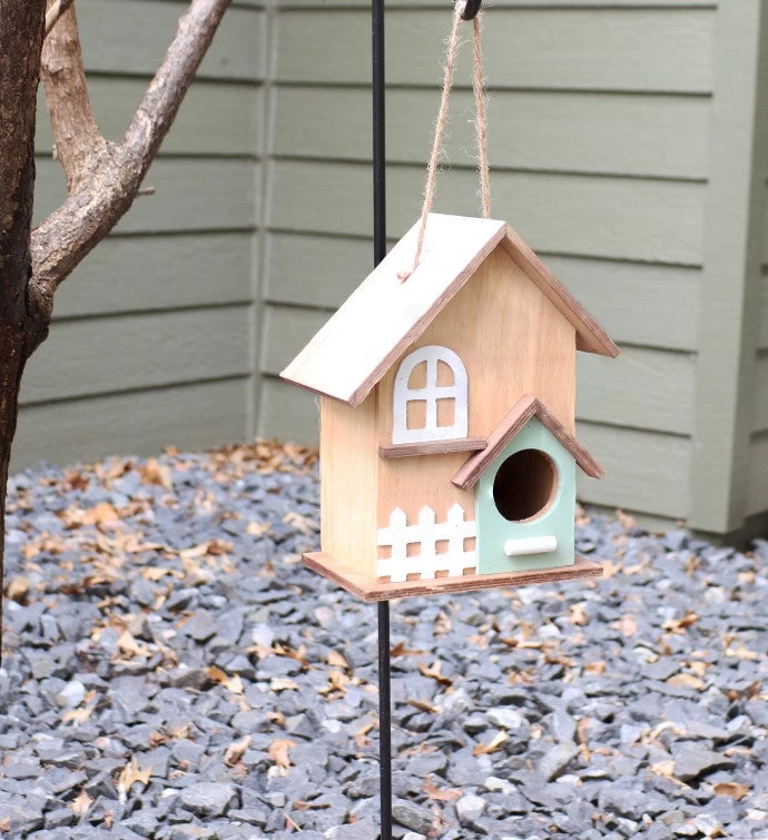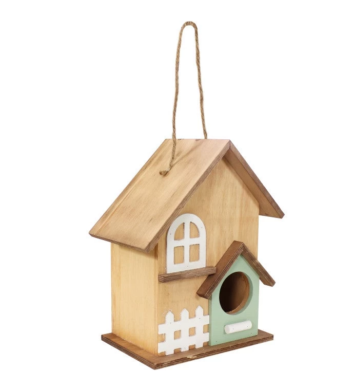 Wooden country cottage outdoor bird house. Includes 1 bird house with attached hanging rope. Plywood. Features charming details, such as a decorative fence and window. Dimensions: 6.75″ W x 4.5″ D x 9.25″ H; 1 lb